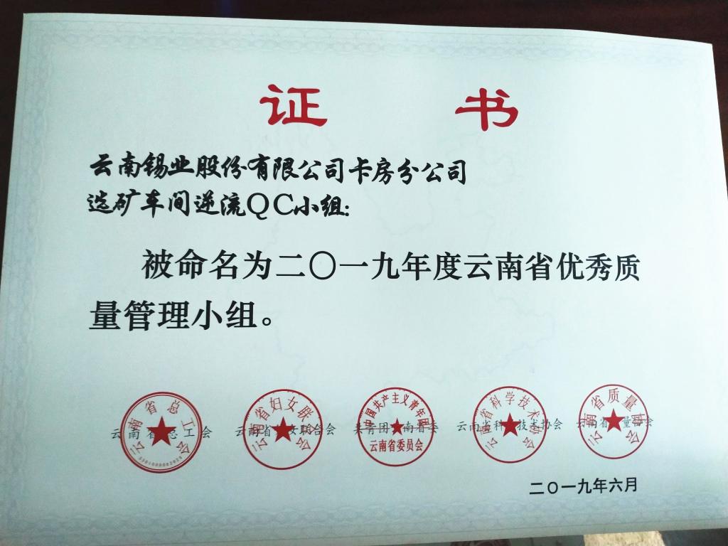 6月27日,在云南省質(zhì)量協(xié)會(huì)QC成果發(fā)布會(huì)上,卡房分公司選礦車間逆流QC小組榮獲2019年度云南省優(yōu)秀質(zhì)量管理小組榮譽(yù)稱號(hào)。