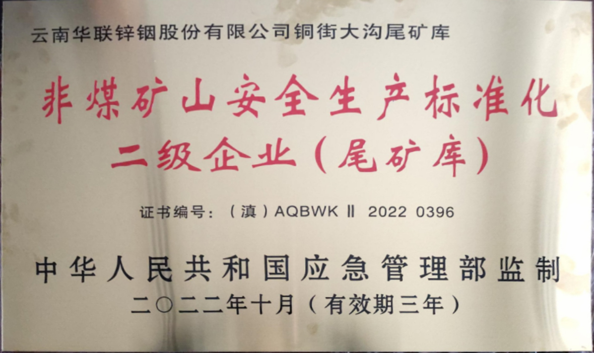 近日,華聯(lián)鋅銦公司銅街大溝尾礦庫、新田尾礦庫順利獲得“非煤礦山安全生產(chǎn)標準化二級企業(yè)”認定,并收到由中華人民共和國應(yīng)急管理局監(jiān)制、云南省應(yīng)急管理廳頒發(fā)的牌匾和證書。