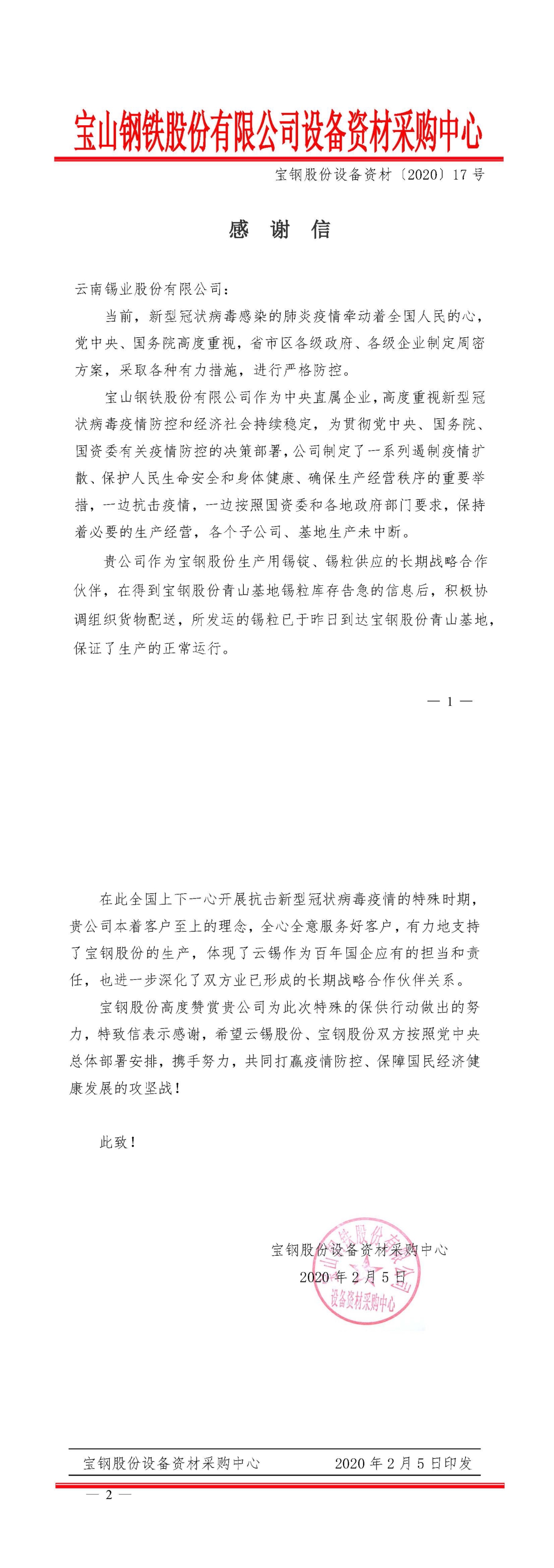 在存在諸多不確定因素的情況下,公司決定抱著嘗試的心態(tài)進行配送,盡最大努力確保供貨。最后,在明確疫情期間需注意事項,確保人員安全的前提下,配送貨車于2月2日從昆山出發(fā),最終順利通過檢查關(guān)卡,于2月4日將貨物安全交付武鋼新日鐵工廠,配送車輛也在武鋼的協(xié)助下順利離開武漢,返往昆山。公司在疫情期間采取特殊方式完成貨物配送,得到了客戶的高度認(rèn)可,寶鋼表示,患難見真情,感謝云錫對寶鋼原料保供的鼎力支持,并為此專門向錫業(yè)股份發(fā)來了感謝信。