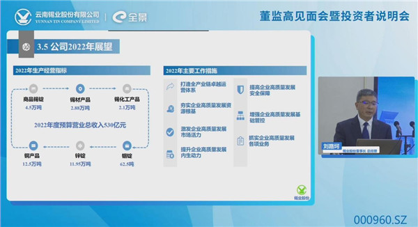 董事長、總經(jīng)理劉路坷介紹了公司資源、業(yè)務(wù)產(chǎn)業(yè)鏈、產(chǎn)品及近期生產(chǎn)經(jīng)營情況,同時充分闡述了公司未來發(fā)展戰(zhàn)略,即圍繞著打造全球錫、銦全產(chǎn)業(yè)鏈供應(yīng)鏈“鏈主”的發(fā)展愿景,以“綠色智能補鏈、精深加工延鏈、改革創(chuàng)新強鏈”為發(fā)展理念,圍繞資源拓展、現(xiàn)代礦山、原材料制造、新材料和精深加工、供應(yīng)鏈五個業(yè)務(wù)單元布局有色金屬全產(chǎn)業(yè)鏈,助推上市公司高質(zhì)量發(fā)展。