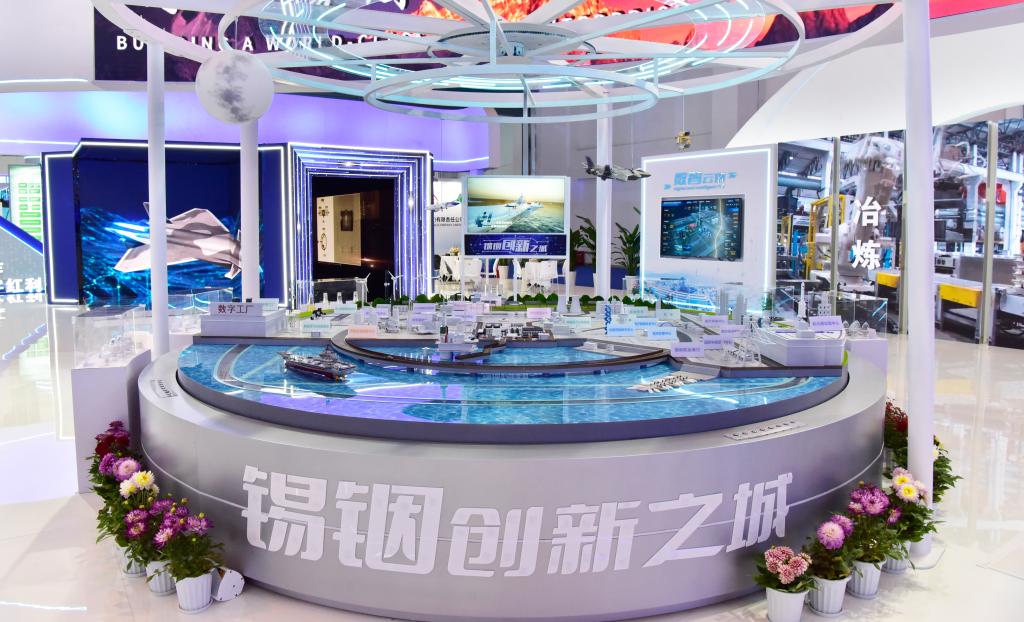 航母、衛(wèi)星、智能機(jī)器人……裸眼3D折角屏以極具視覺震撼的特效,生動(dòng)展示錫基、銦基合金在大國重器制造中的應(yīng)用,成為制造業(yè)館的靚麗打卡點(diǎn)。