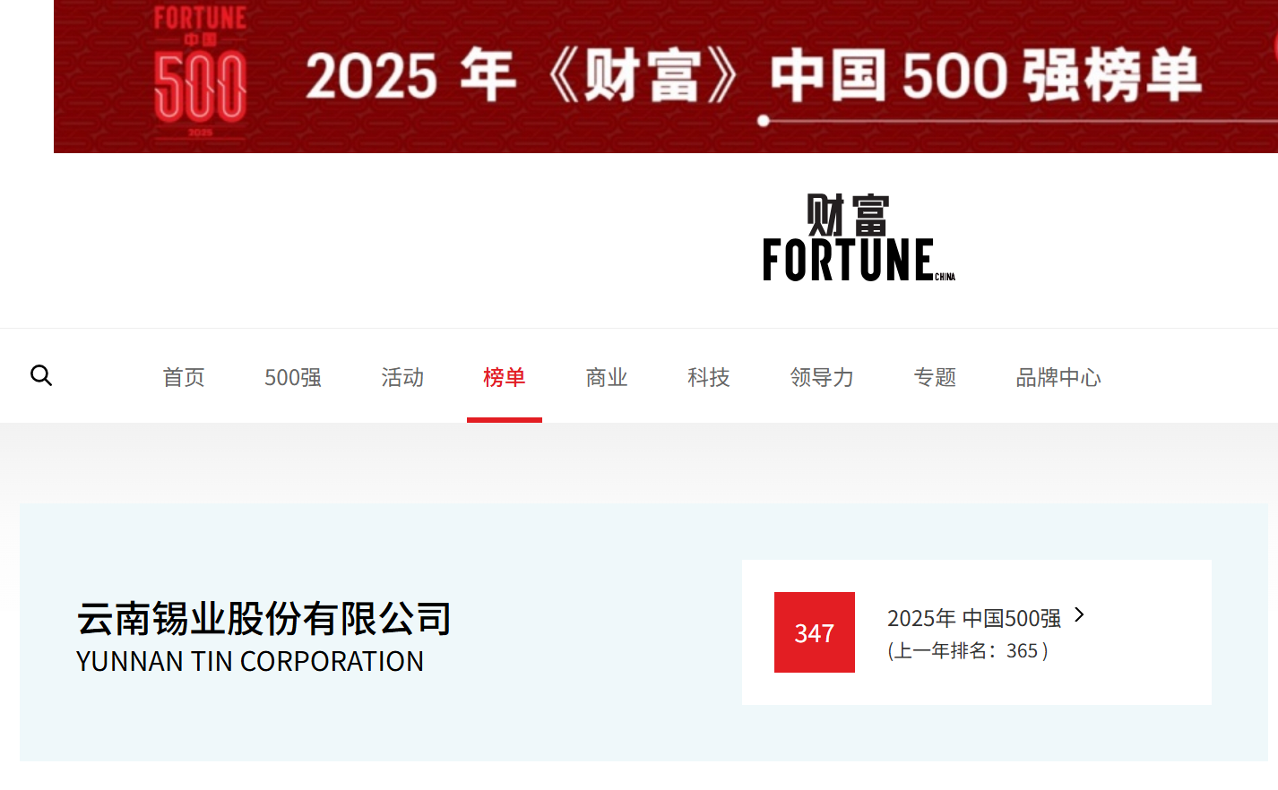 7月22日,2025年《財富》中國500強排行榜發(fā)布,錫業(yè)股份位居第347位,較去年排名上升18位。